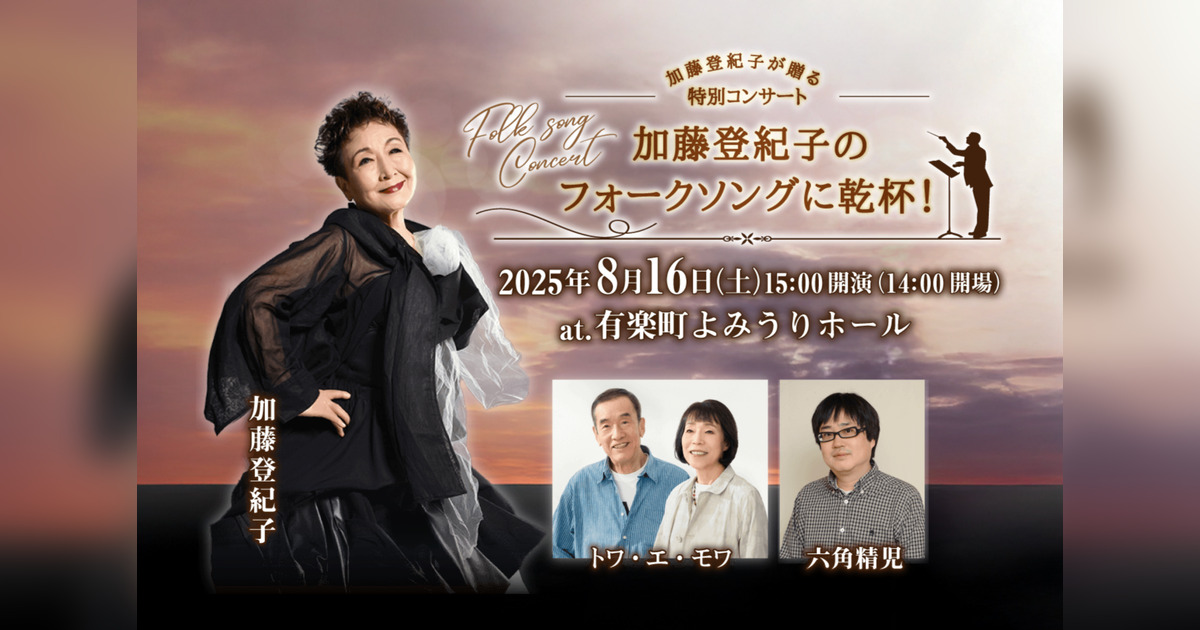 2025年8月16日(土)、東京・有楽町よみうりホールにて、名曲とともに戦後80年を振り返る特別コンサート「加藤登紀子のフォークソングに乾杯 〜戦後80年トーキョーフォーク 記憶のうた、未来へのうた〜」を開催いたします。