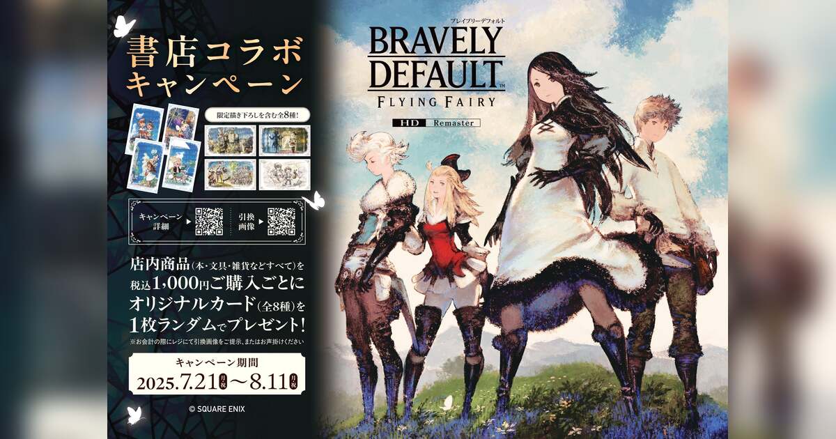 日本出版販売株式会社(代表取締役社長:富樫 建、略称:日販)は、株式会社スクウェア・エニックス(代表取締役社長:桐生 隆司)が手掛けるRPG『ブレイブリーデフォルト フライングフェアリー HDリマスター』の発売を記念して、2025年7月21日(月)より全国54書店にて、商品ご購入時にオリジナルカードがもらえる書店コラボキャンペーンを実施します。