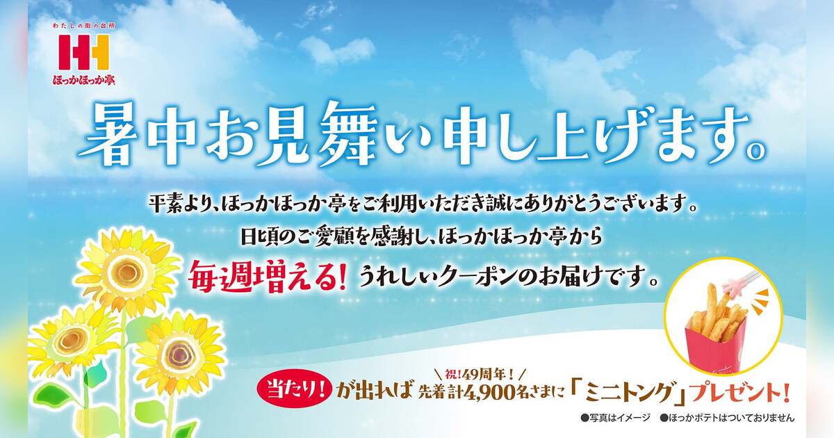 持ち帰り弁当事業のパイオニアである「株式会社ほっかほっか亭総本部(本社:大阪府大阪市、代表取締役会長兼社長:青木達也)は、日頃のご愛顧へ感謝の気持ちを込めて、ほっかほっか亭店舗でお弁当またはおかずを購入いただいたお客さまに、クーポン付「暑中お見舞い」を配布するキャンペーンを実施いたします。