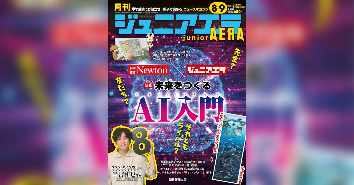 親子で楽しく読めて、中学受験・高校入試の勉強にも役立つ、小・中学生のためのニュース月刊誌ジュニアエラ2025年8・9月合併号が、7月15日(火)に発売されました。今号の特集は「未来をつくる AI入門」。科学雑誌「Newton」と初コラボしました。四つ折りの特大スペシャルポスター付録「海の生き物たち」付き。スペシャルインタビューは、映画「8番出口」に主演する二宮和也さんです。