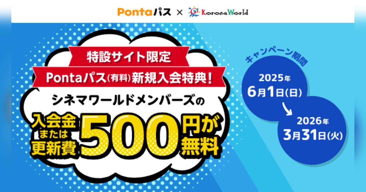 KDDIは、約1,500万人が利用しているおトクなサブスクリプションサービス「Pontaパス」(月額548円)の新規入会特典として、コロナシネマワールドでおトクに映画鑑賞を楽しめる会員サービス「シネマワールドメンバーズ」の新規入会費または更新費500円が無料になるキャンペーンを実施します。