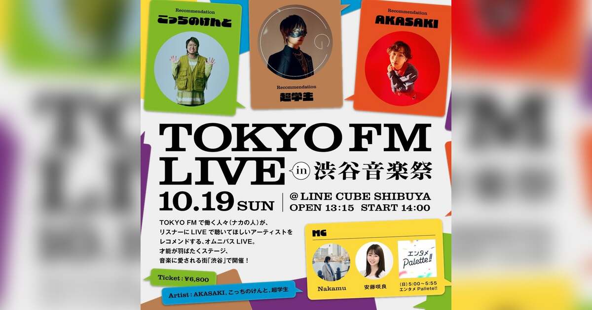 今年はコンテンツ第一弾として、LINE CUBE SHIBUYAにて、ライブイベント『TOKYO FM LIVE in 渋谷音楽祭』の開催が決定。出演は、“TOKYO FMのスタッフ陣がレコメンドする、今、ライブを観てほしいアーティスト” AKASAKI、こっちのけんと、超学生。MCには、TOKYO FMで放送中のおすすめエンタメ情報を紹介する番組『エンタメPalette!!』パーソナリティのNakamu、安藤咲良が務めます。