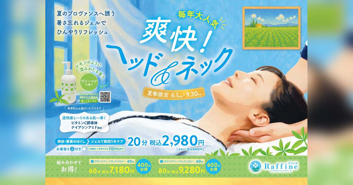 「人々が心身ともに健康で元気に暮らすことができる社会づくりのための事業」に取り組むラフィネグループの株式会社ボディワークホールディングス(代表取締役:清水秀文、住所:東京都中野区)は、【夏季限定】『爽快!ヘッド&ネック』キャンペーンを、全国のリラクゼーションスペース「ラフィネ・プチラフィネ・ラフィネプリュス」の店舗で、6月1日(日)~9月30日(火)まで実施しております。