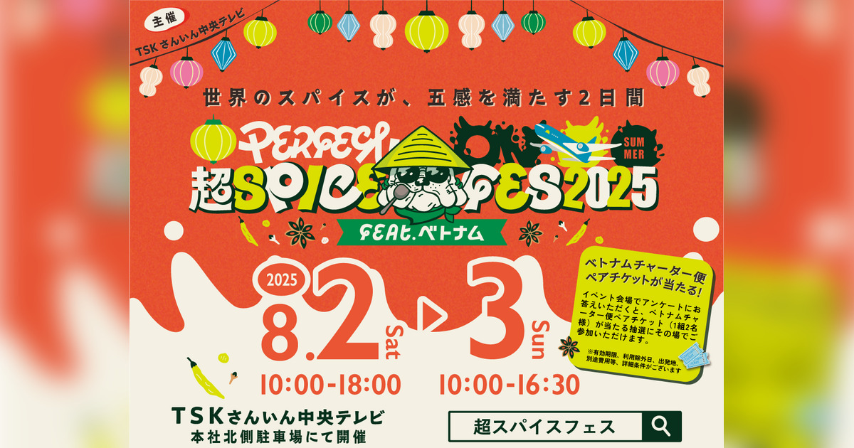 世界のスパイス料理の祭典『超スパイスフェス』を、8月2日(土)、3日(日)の2日間、松江市向島町のTSKさんいん中央テレビ本社特設会場で開催します!!