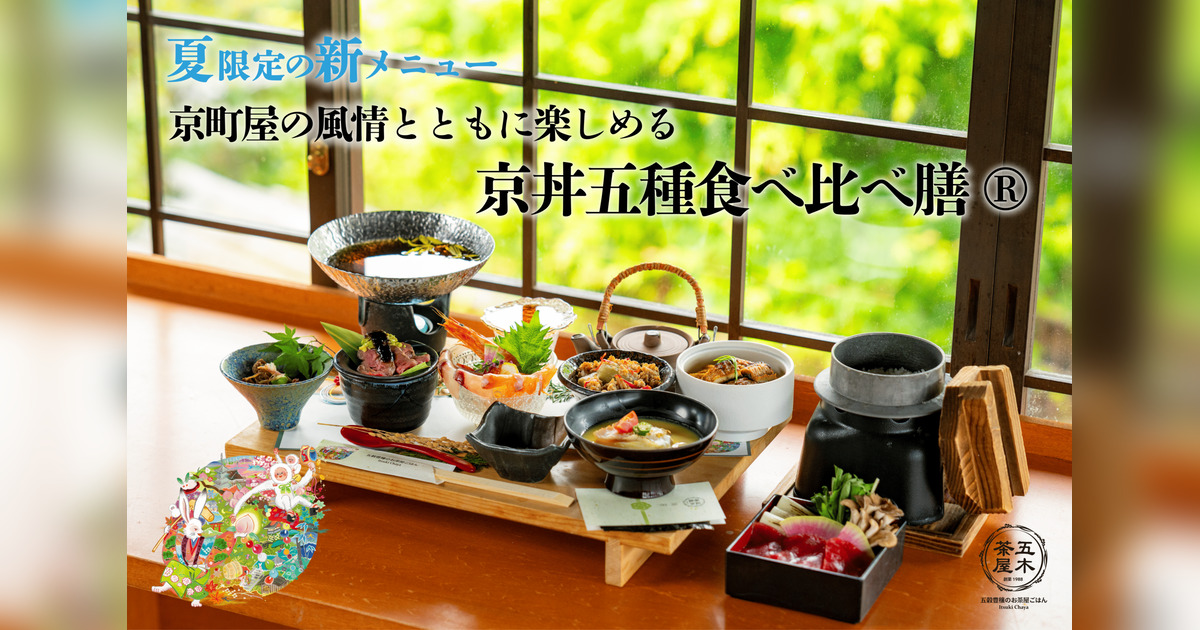 五穀豊穣のお茶屋ごはん®︎ 五木茶屋 清水店では、旬の海鮮を使用した【夏の京丼五種食べ比べ膳®︎】をご用意しました。夏の海鮮の旨味、美しい見た目を京町屋の空間でゆったりとお楽しみください。
