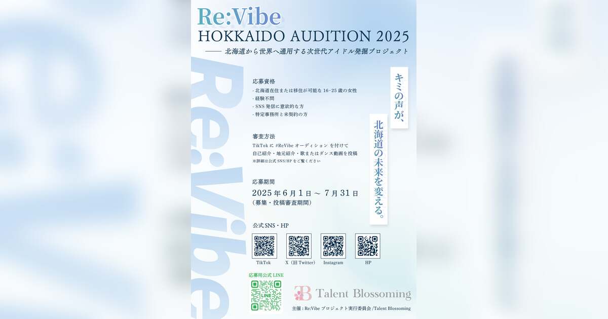 Re:Vibeプロジェクト実行委員会(主催:Talent Blossoming)は、北海道の地から世界を舞台に活躍できる次世代型アイドルを発掘・育成する新プロジェクト「Re:Vibe HOKKAIDO AUDITION 2025」を開催いたします。本オーディションは、デジタルネイティブ世代のSNS発信力と地元愛を基軸に選考する、参加型・地域密着型の全く新しいスタイルの発掘プロジェクトです。