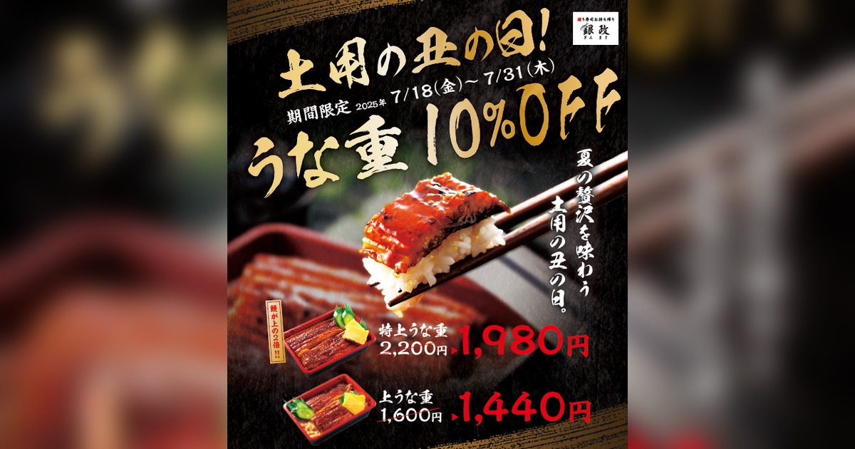 ワタミ株式会社(本社:東京都大田区)が展開する「握り寿司お持ち帰り 銀政」では、2025年7月18日(金)~7月31日(木)の期間限定で、土用の丑の日にあわせ「うな重」を特別価格で販売いたします。