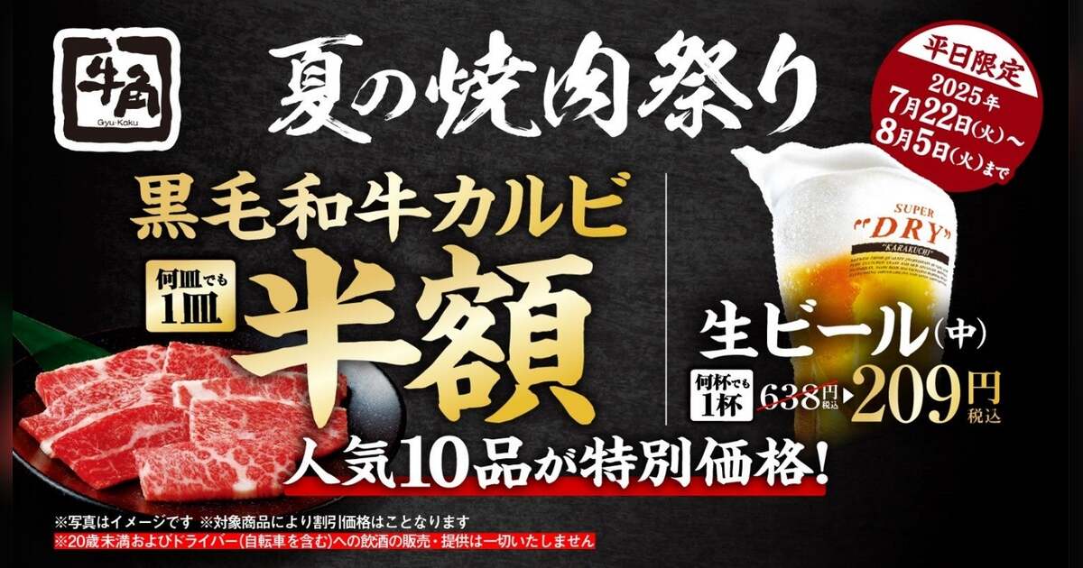 コロワイドグループの株式会社レインズインターナショナルが展開する牛角では、2025年7月22日(火)から8月5日(火)の平日限定で「牛角夏の焼肉祭り」を実施いたします。本キャンペーンでは、黒毛和牛カルビをはじめとした人気商品10品が、何皿ご注文いただいても特別価格でお楽しみいただける内容となっております。