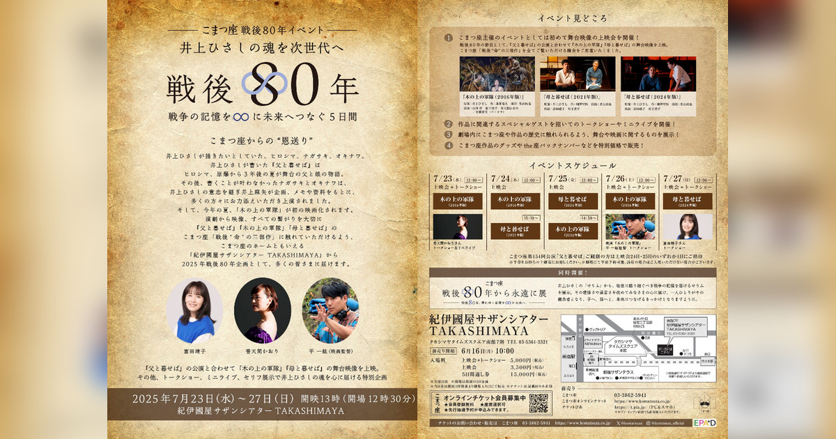 こまつ座は1983年、作家・劇作家の井上ひさしが座付作家として立ち上げ、翌年『頭痛肩こり樋口一葉』で旗揚げ。以降、井上ひさしに関わる舞台を中心に作り続けてます。演劇で平和を伝えたいとしていた井上ひさしの魂を引き継ぎ、戦後80年となる本年、紀伊國屋サザンシアターTAKASHIMAYAにてこまつ座「戦後”命”の三部作」の『木の上の軍隊』『母と暮せば』からスペシャルゲストに普天間かおりさん、平一紘監督、富田靖子さんをお迎えしてのミニコンサート、トークショー、舞台上映会のイベントを開催します。