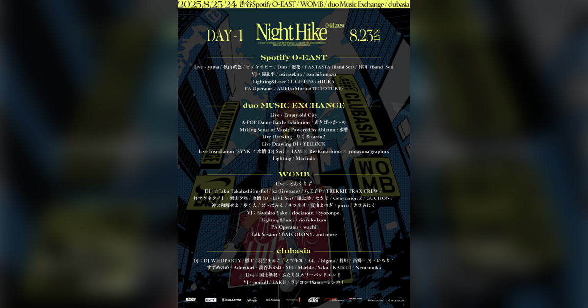 2025年8月23日(土)・24日(日)の2日間にわたり、渋谷・Spotify O-EAST、WOMB、duo MUSIC EXCHANGE、clubasiaの4会場を舞台に、都市型ミュージックアートフェス「NIGHT HIKE Mid 2025 supported by ジンドゥー」が開催されます。本フェスは、“インターネット発の創作文化”をテーマに掲げ、音楽・映像・ダンス・インスタレーション・トークが交差する体験型フェスとして注目を集めてきました。