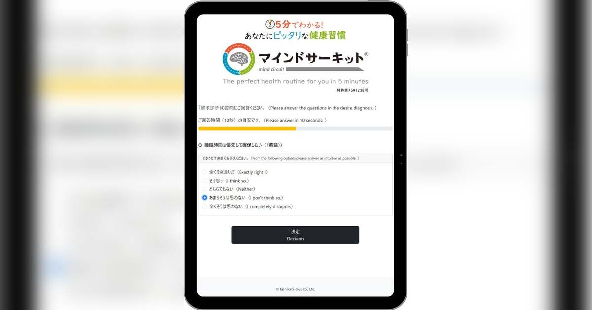 たしかにプラス株式会社(本社:大阪市北区、代表取締役:深谷 泰亮、以下 たしかにプラス)は、健康食品や健康習慣に興味をもった人が誰しも一度は体験する「やってはみたものの続かなかった」という悩みに対して、自分にあった健康習慣を身につけられるプログラム「マインドサーキット®」を開発しました。