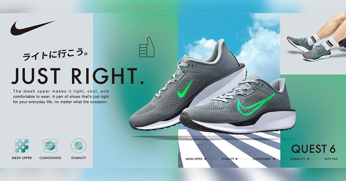 「NIKE QUEST 6」は、“ちょうどいい”機能性とデザインを兼ね備えたあらゆる人の日常にフィットするスポーツシューズです。スポーツシューズとして快適なランニングを生み出すために、安定性をもたらすサポート性に優れた足中央部のフィットバンドや、衝撃を吸収する抜群に柔らかいミッドソールフォームの搭載等機能性はもちろんのこと、アッパーに配置された大きなスウッシュが目を引くシンプルなデザインに、あらゆるコーデにも合わせやすい落ち着いたカラーや差し色となるビビットなカラー展開で、スポーツシーンだけでなくプライベートでもスポーティーなコーデに合わせやすい一足となっています。