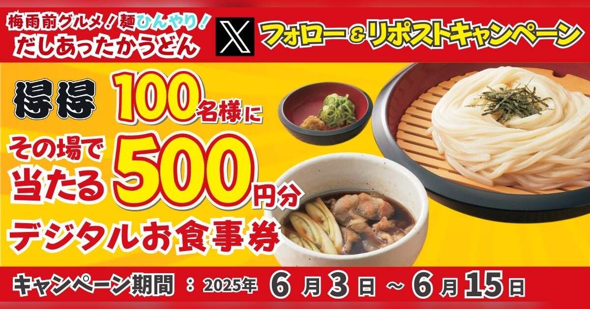 株式会社家族亭(本社・大阪府大阪市、代表取締役社長・坪山 憲司)が運営するうどんチェーン「得得(とくとく)」は、2025年6月3日(火)午後8時~6月15日(日)の期間に得得公式Xで「得得デジタルお食事券500円分」が100名様にその場で当たる「Xフォロー&リポストキャンペーン」を実施いたします。得得の公式Xをフォローし、キャンペーンポストをリポストすることで参加ができ、その場で抽選結果が分かります。「得得デジタルお食事券」は、得得の店内飲食、テイクアウトでご利用いただけます。