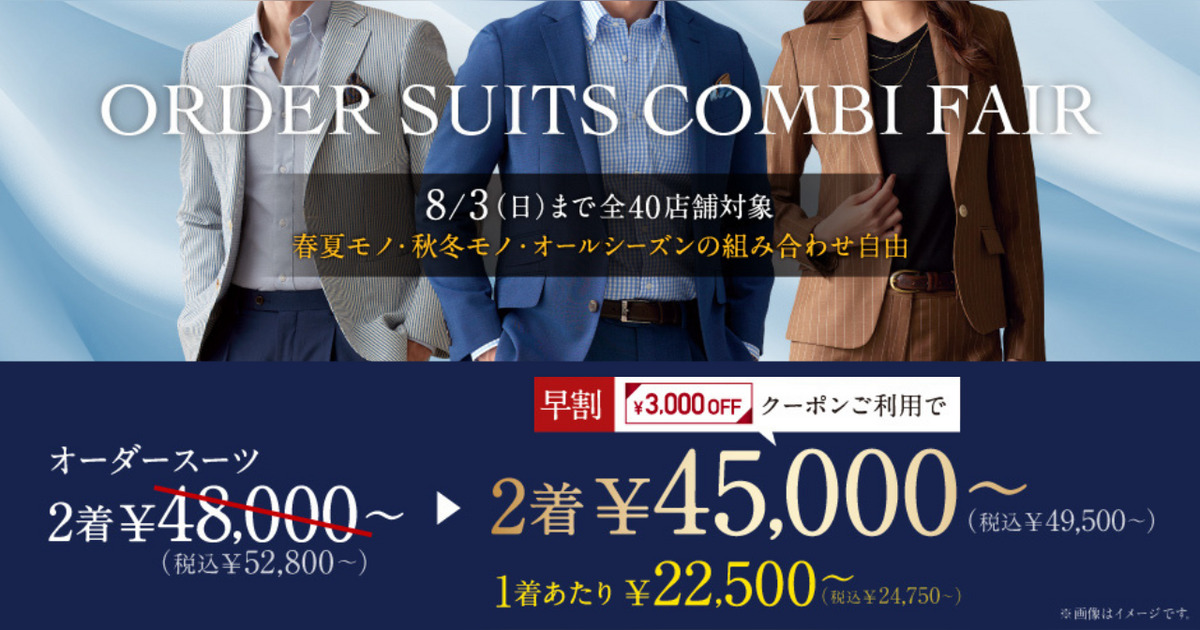 オーダースーツ専門店「グローバルスタイル」を運営するグローバルスタイル株式会社(東京証券取引所 スタンダード市場:7126、本社:大阪市中央区、代表取締役社長 田城弘志)は、対象プランのご利用で、本格オーダースーツ『3,000円OFF』早割クーポンをプレゼントするフェアを開催いたします。クーポンのご利用で1着あたり22,500円~(税込24,750円~)ご購入いただけます。フェアは7月17日(木)から8月3日(日)までの期間限定、全店舗対象です。