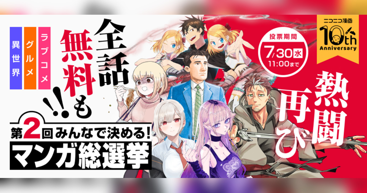 株式会社ドワンゴは、同社が運営する国内最大級のWEBマンガサービス「ニコニコ漫画」のアプリ公開10周年を記念した特別企画第一弾として、2025年7月16日(水)から7月30日(水)の期間中、各人気ジャンルの1位を決定するユーザー参加型投票企画「みんなで決める!第2回・マンガ総選挙」の一般投票を実施します。