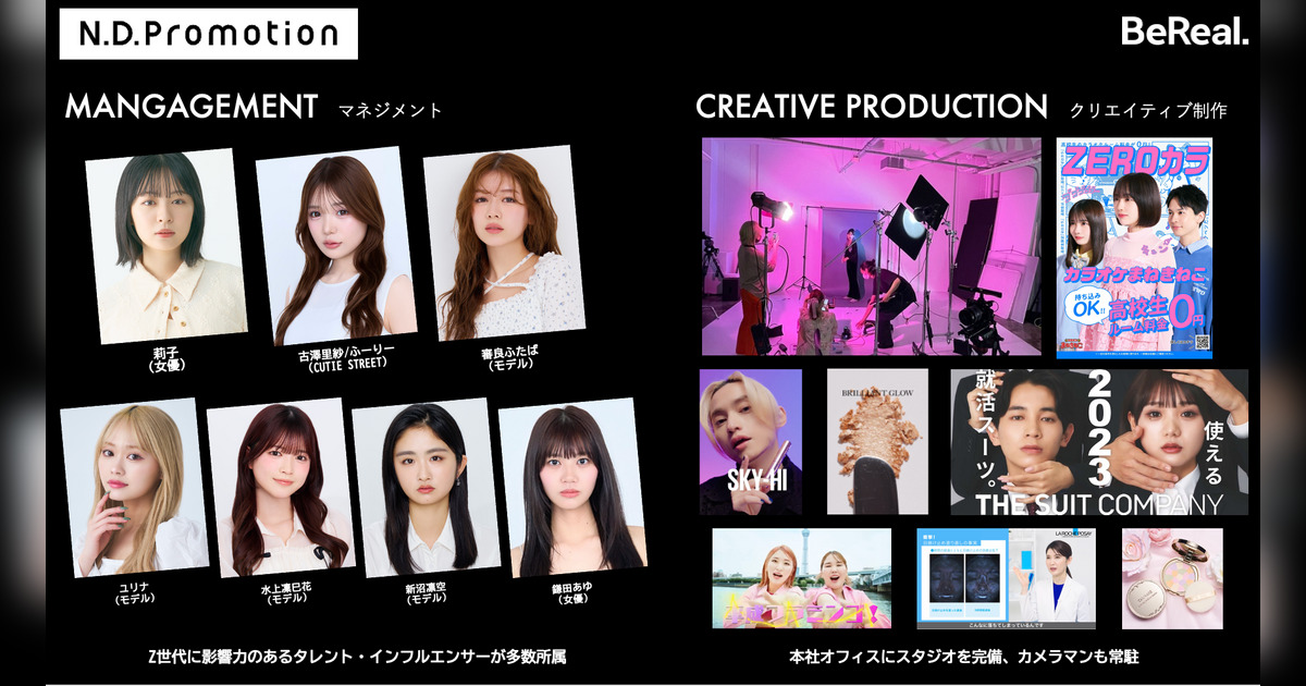 株式会社N.D.Promotion(本社:東京都渋谷区、代表取締役社長:金丸雄一、以下N.D.Promotion)は、BeReal社(本社:フランス、パリ CEO:Aymeric Roffé)が運営する写真共有アプリ「BeReal.」のコンテンツパートナー協業パッケージ『BeUP!』を販売開始いたします。