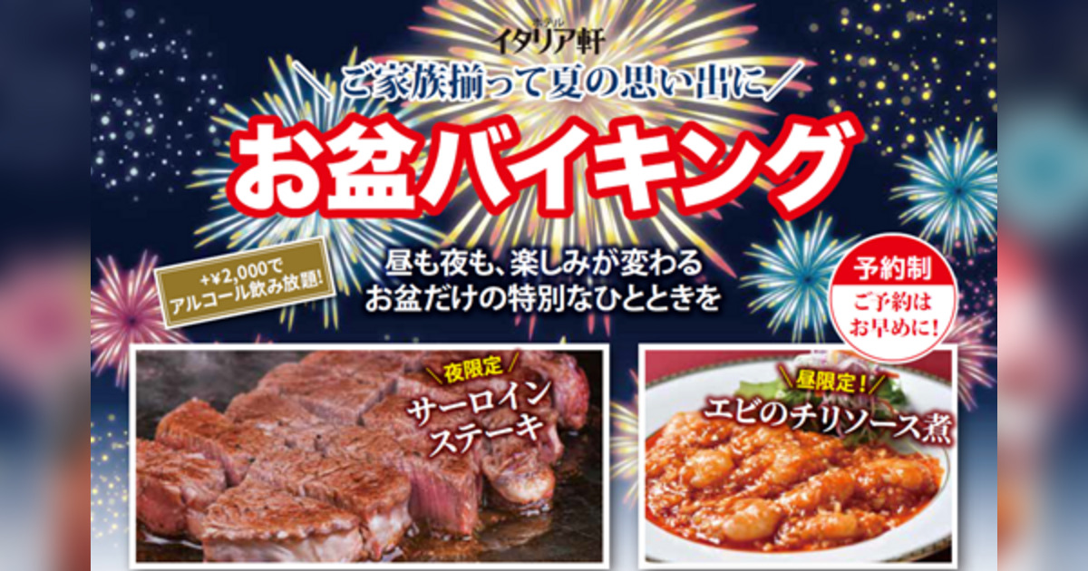 NSGグループのホテルイタリア軒では、ご家族皆様の夏の思い出作りにぴったりな『お盆バイキング』を8月13日(水)に昼の部・夜の部で開催いたします。