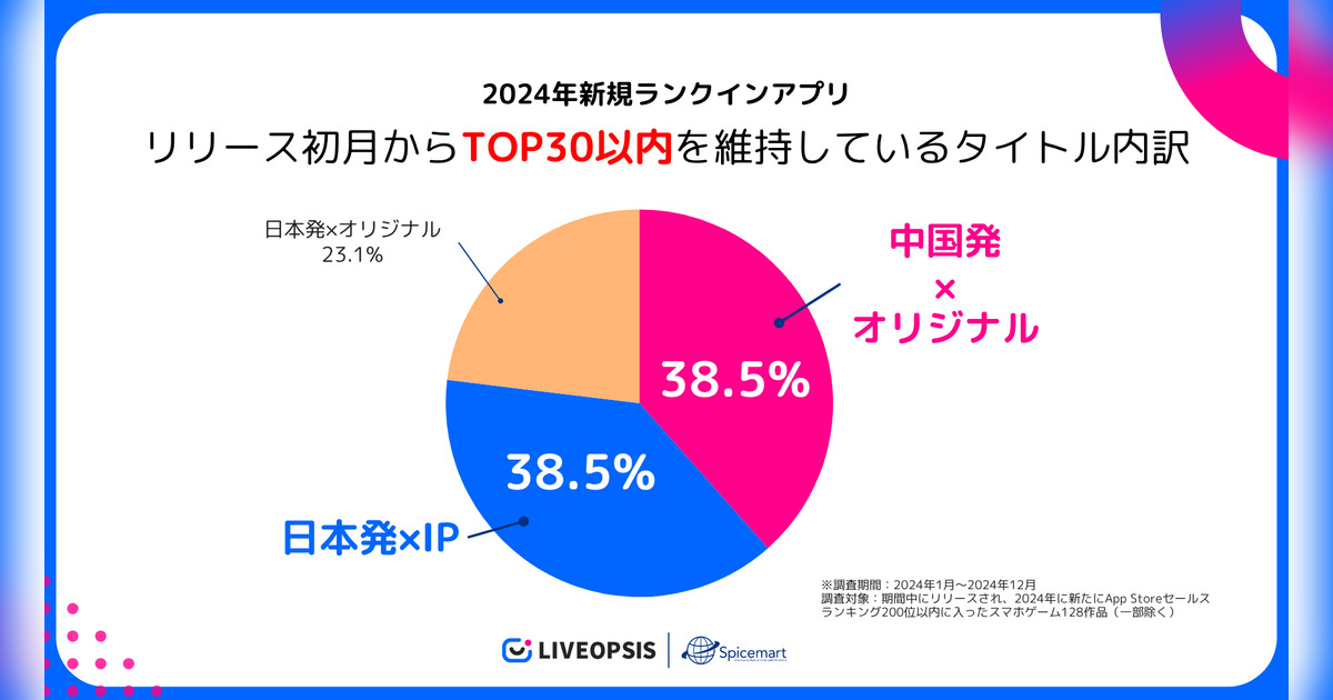 株式会社スパイスマートは、スマホゲーム専門の運営ソリューション『LIVEOPSIS』の「新規ランクインアプリ」機能を活用し、2024年に新たにApp Storeセールスランキング200位以内に入ったスマホゲームを調査しました。