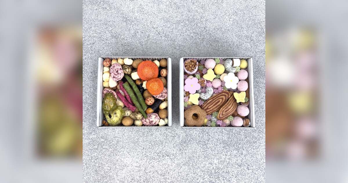 味も色も楽しい豆菓子はもちろん、海苔巻きあられや生姜あられも入っていて、お煎餅好きにも嬉しいポイント。