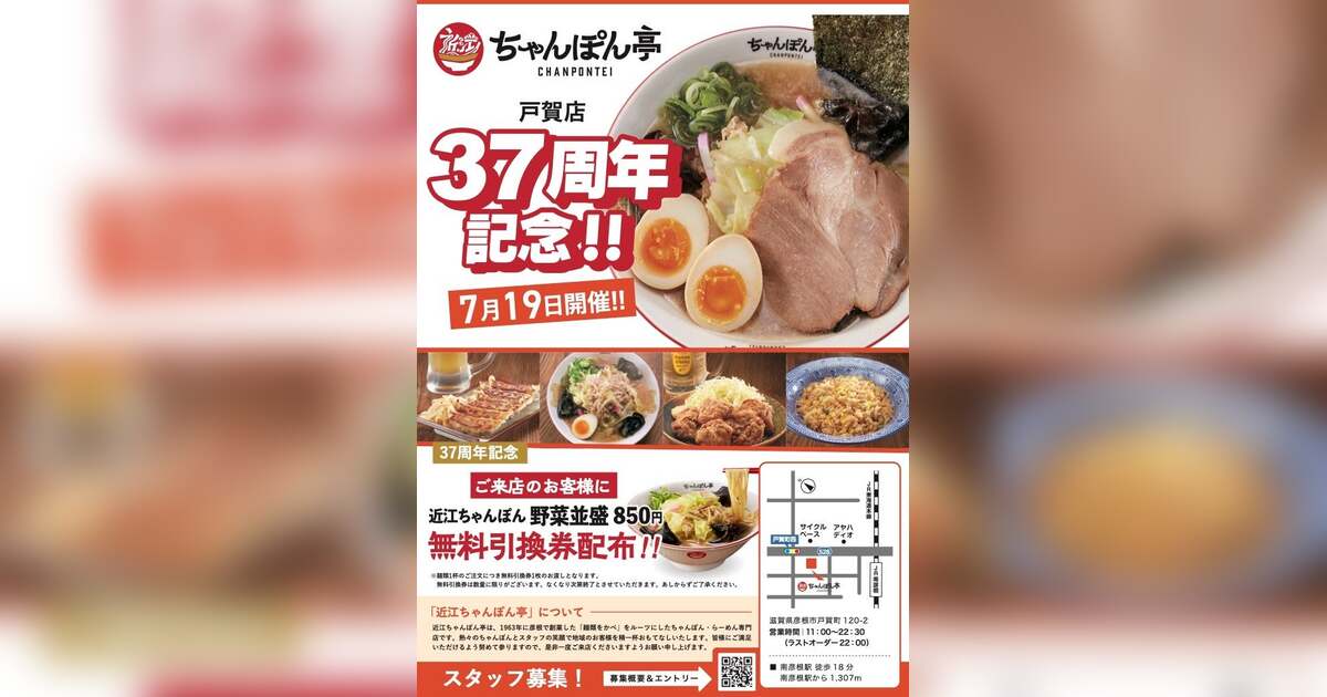 「近江ちゃんぽんをニッポンのちゃんぽんに!」を掲げるドリームフーズ株式会社(本社:滋賀県彦根市/代表取締役:山本英柱)は、2025年7月19日(土)、近江ちゃんぽん亭ブランドの第1号店である「戸賀店」にて、開業37周年を記念した「周年祭」を開催いたします。