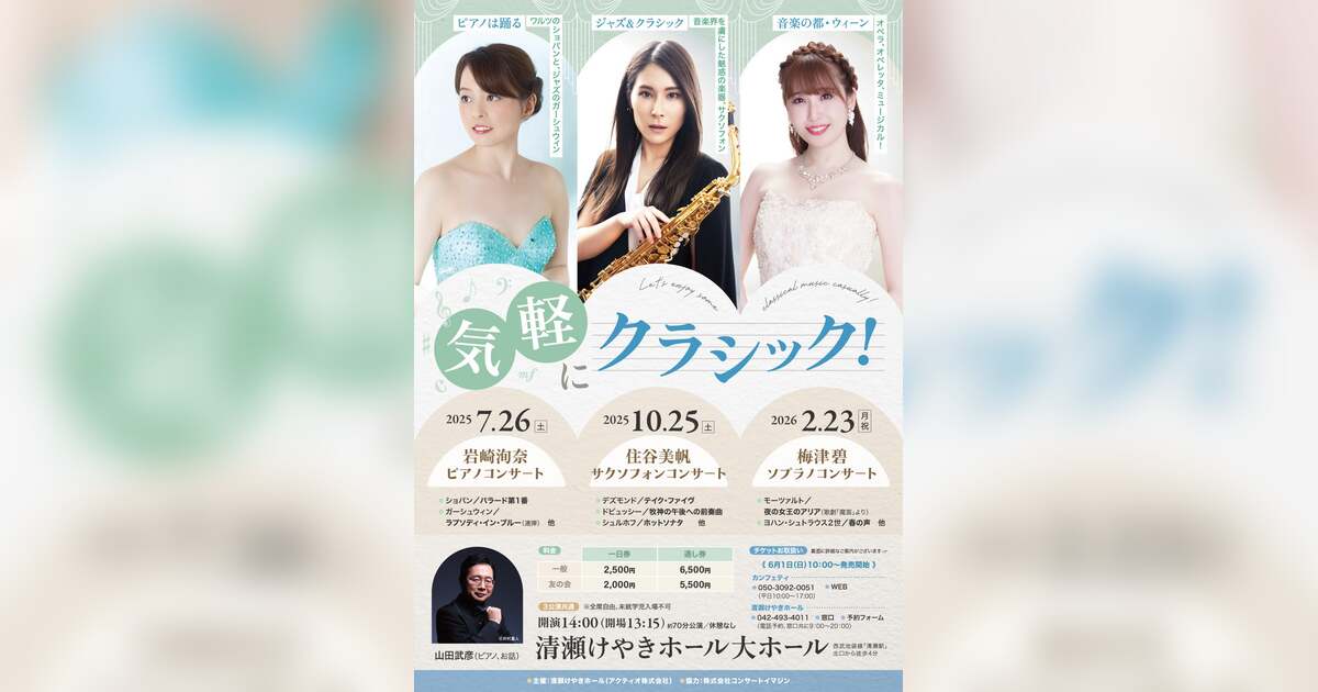 7/26岩崎洵奈(ピアノ)、10/25住谷美帆(サクソフォン)、2026/2/23梅津碧(ソプラノ)の全3公演。お得な通し券もあります!