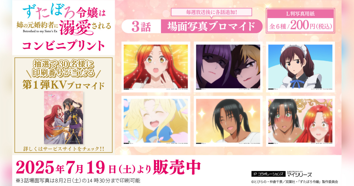 夏アニメで話題沸騰中の「ずたぼろ令嬢は姉の元婚約者に溺愛される」コンビニプリントに「場面写真」第3話が追加されました。