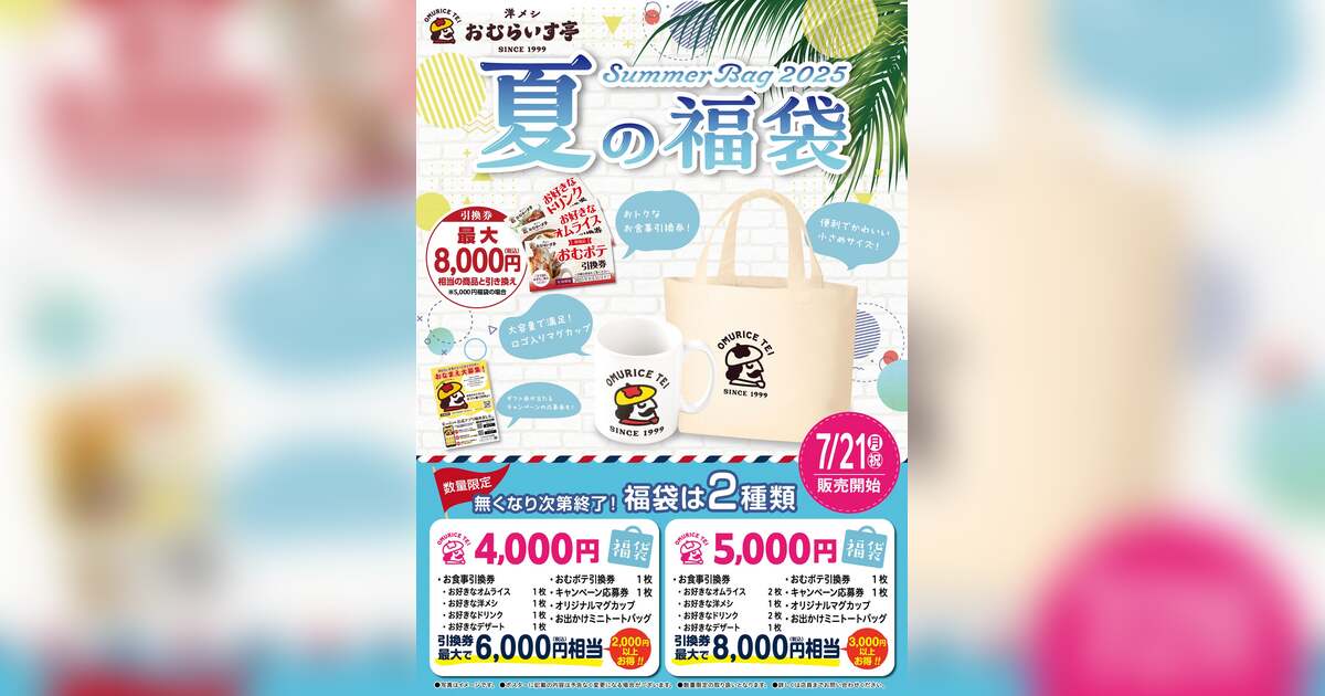 「おむらいす亭」では夏のひとときをお得に過ごす数量限定の「福袋(レストラン店舗・バージョン)」2種類を7月21日(月・祝)より販売いたします。内容は、お得な「お食事引換券」に新メニュー「おむポテ引換券」そして、非売品のオリジナルグッズなどが入ったこの夏だけの贅沢な福袋です。ひと夏の想い出づくりにも是非、ご購入ください。皆さまのご来店をスタッフ一同、お待ちしております。※福袋販売レストラン実施店舗は下記に記載させていただきます。