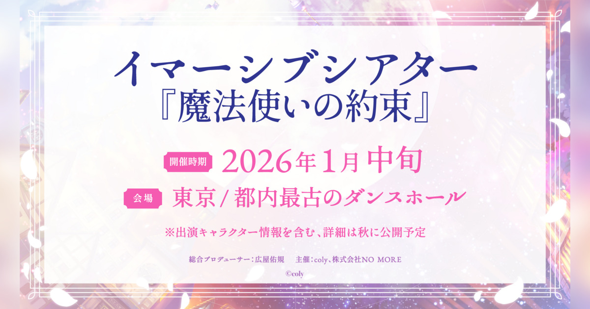 体験型没入エンターテイメントやイマーシブコンテンツを提供する株式会社NO MORE(本社:東京都渋谷区、代表取締役:佐田晋一郎)は、株式会社coly(所在地:東京都港区、代表取締役社長:中島杏奈)と共同で、人気育成ゲーム『魔法使いの約束』を原作とした「イマーシブシアター『魔法使いの約束』」を2026年1月中旬に上演することを発表いたします。