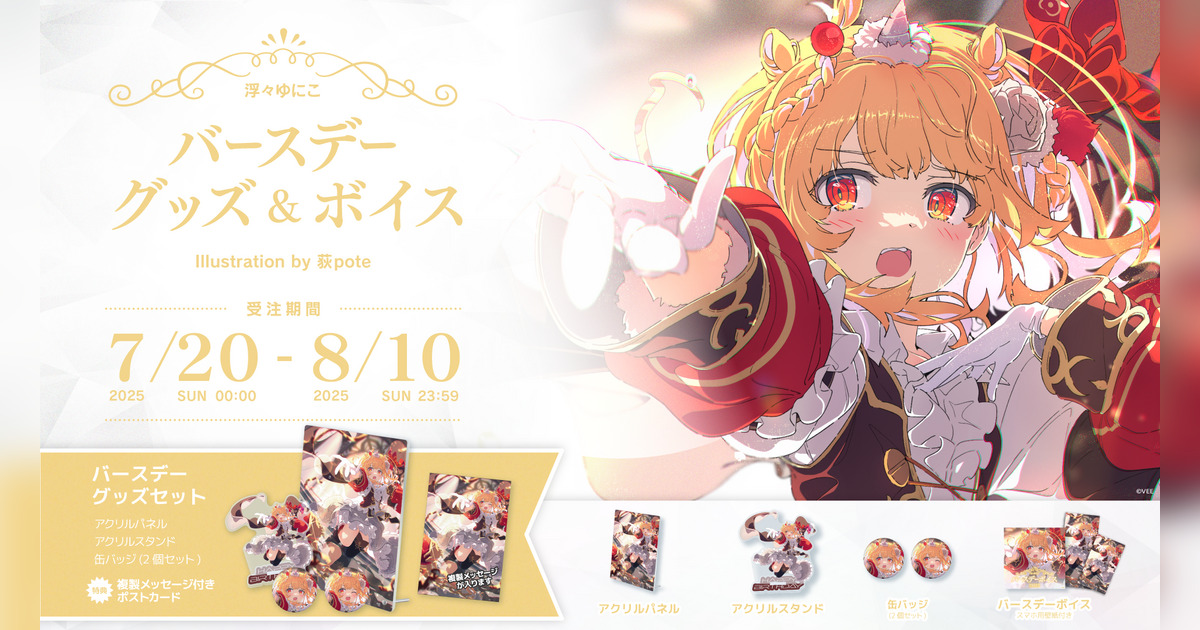本日・7月20日に誕生日を迎えた浮々ゆにこのバースデーグッズの詳細を公開するとともに、公式オンラインショップ「VEE Official Shop」にて受注販売を開始しました。