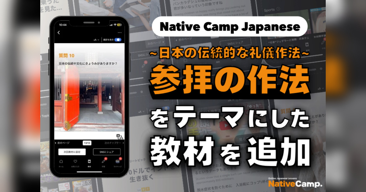 株式会社ネイティブキャンプ(本社:東京都渋谷区、代表取締役社長:谷川国洋)が提供するオンライン日本語会話サービス『Native Camp Japanese』では、このたび、人気教材「デイリートピック」に”参拝の作法”をテーマにした教材を追加しました。