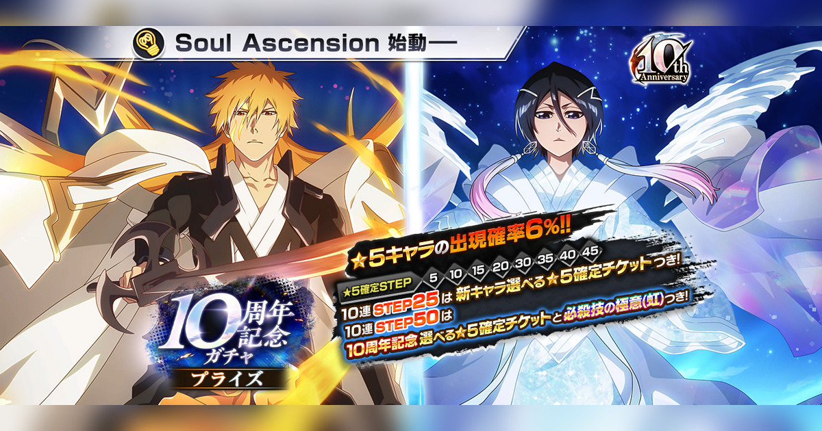 新★5キャラクターには、黒崎一護(10周年記念ver.)、朽木ルキア(10周年記念ver.)が登場します。10連はSTEP25で「新キャラ選べる★5確定チケット【10周年記念】」が、STEP50では、「10周年記念特別選べる★5確定チケット【10周年記念】」と「必殺技の極意(虹)」がもらえる!
