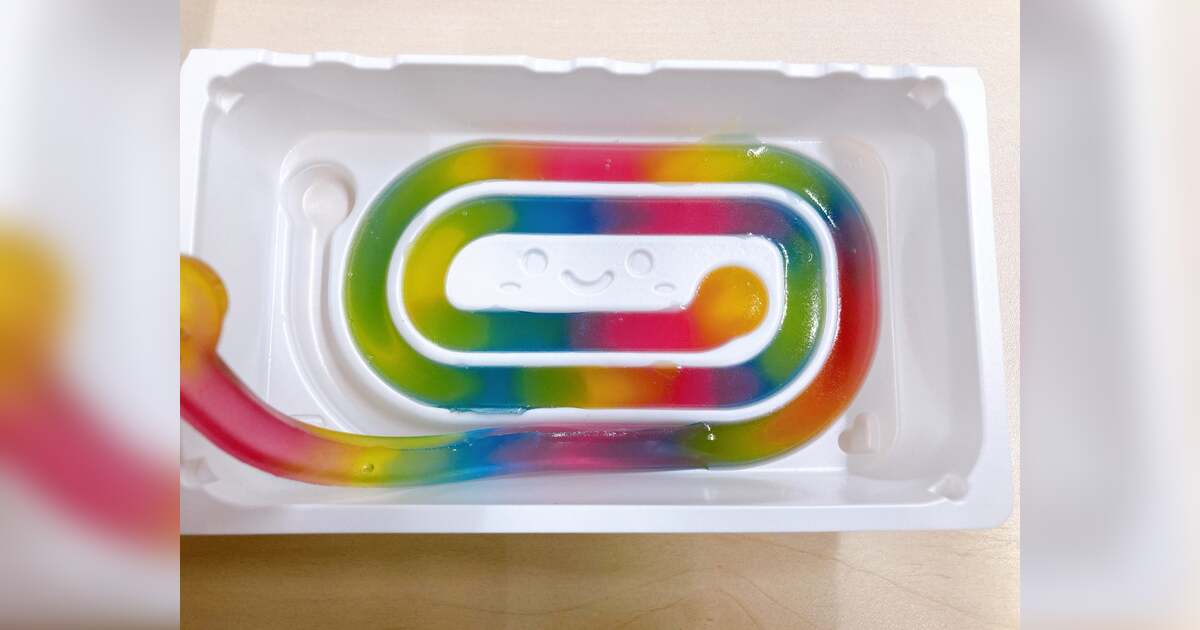 また、トレーの中央には、ニコッとした笑顔のモチーフを配置しています。包装を開けた瞬間から、ワクワクし、作ることが楽しみになるようデザインいたしました。また、ぐるぐるしている形状のため、色のグミ液を流し込んだ時に自然と液体がトレーに沿って動くのも面白いポイントです。