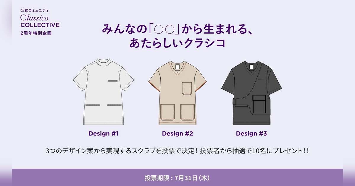 テーラード技術を取り入れた白衣を中心に、メディカルアパレルの企画・開発・販売を行うクラシコ株式会社(本社:東京都港区、代表取締役CEO:大和 新)は、公式ユーザーコミュニティ「Classico COLLECTIVE(クラシココレクティブ)」の開設2周年を記念した参加型プロジェクト「みんなの『◯◯』から生まれる、あたらしいスクラブ」において、ユーザーの声をもとに制作した複数のスクラブデザイン案を現在公開中です。