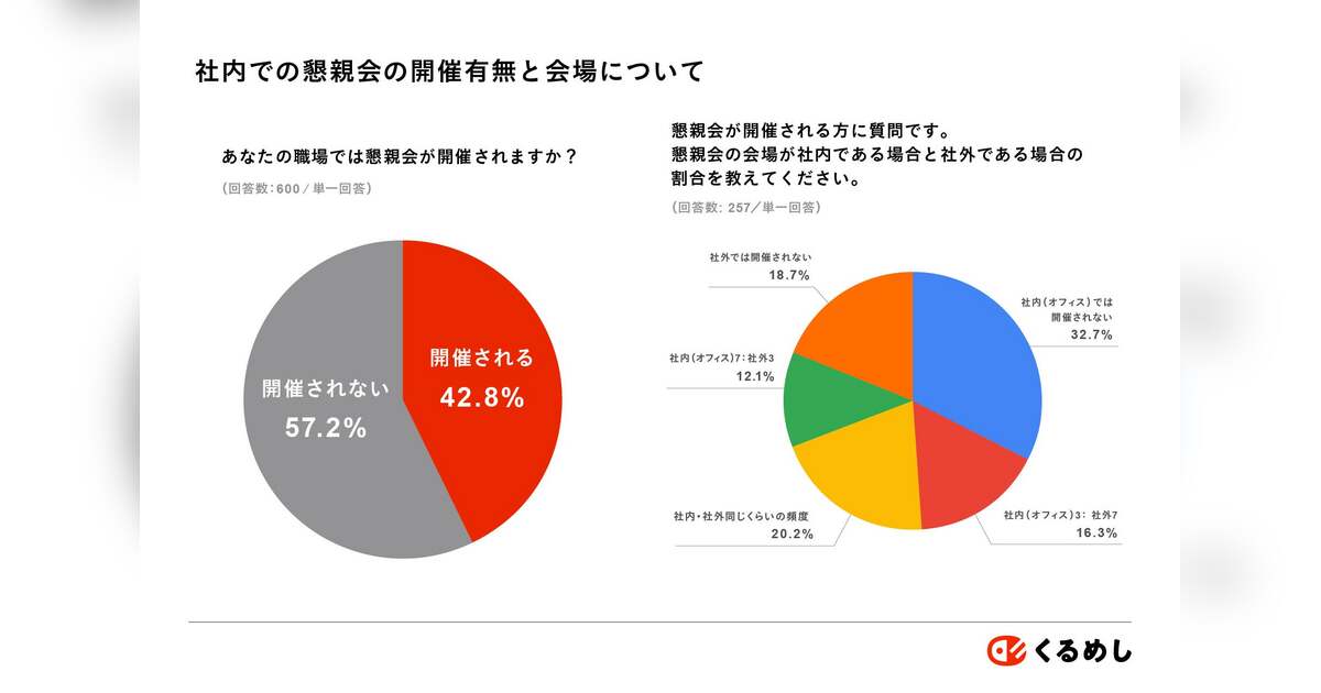 懇親会を開催する企業は42.8%。懇親会を社内開催する割合が最も多いのは大企業で39%