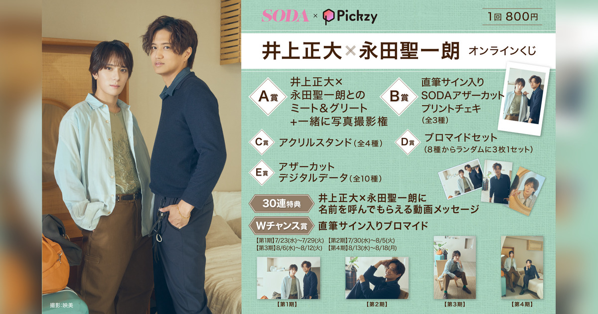 2025年7月23日(水)に、ぴあのオンラインくじサービス「Pickzy(ピクジー)」(https://pickzy.pia.jp/)にて、「SODA×Pickzy 井上正大×永田聖一朗 オンラインくじ」の販売を開始いたしました。