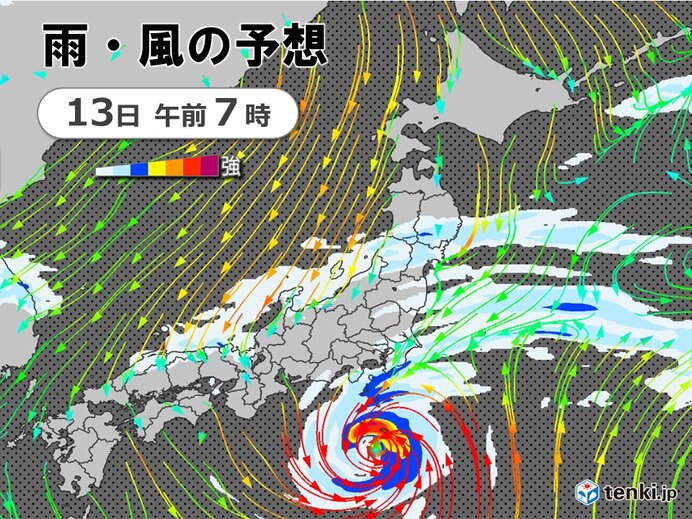伊豆諸島では明日13日は、飛来物によって負傷したり、走行中のトラックが横転する恐れのある猛烈な風が吹く所があるでしょう。