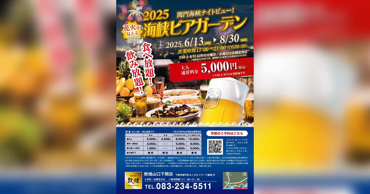 四川料理をベースに、中国料理店として伝統と現代のトレンドが調和する料理を提供してきました「敦煌」山口下関店では6月13日(金)より花火が見える海峡ビアガーデンを8月30日(土)まで開催いたします。食べ放題・飲み放題を納涼と絶景のナイトビューと共にお楽しみください。特に亀山花火大会(7/30)、海峡花火大会(8/13)は圧巻のロケーションとしてご堪能ください(別料金が発生いたします)。1週間前からのご予約可能で早割(大人料金500円引き)の特典も付きます。どうぞご利用ください。皆さまのご来店をスタッフ一同お待ちしております。                          ※花火の打ち上げは、8月の毎週土曜日と7月30日(水)・8月13日(水)の花火大会の予定です。