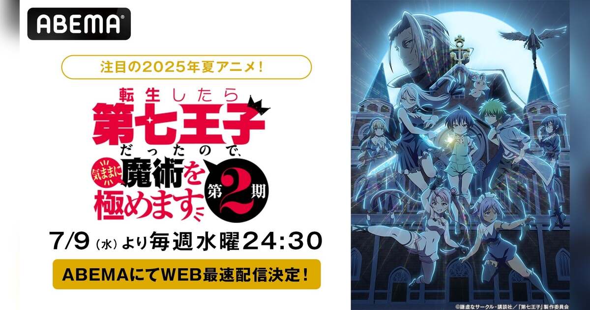このたび「ABEMA」にて『転生したら第七王子だったので、気ままに魔術を極めます 第2期』のWEB最速配信が決定いたしました。2025年7月9日(水)から毎週水曜日夜24時30分より、「ABEMAアニメチャンネル」にて無料放送するとともにWEB最速配信を開始。放送後、のちほど最新話を1週間無料でお楽しみいただけます。