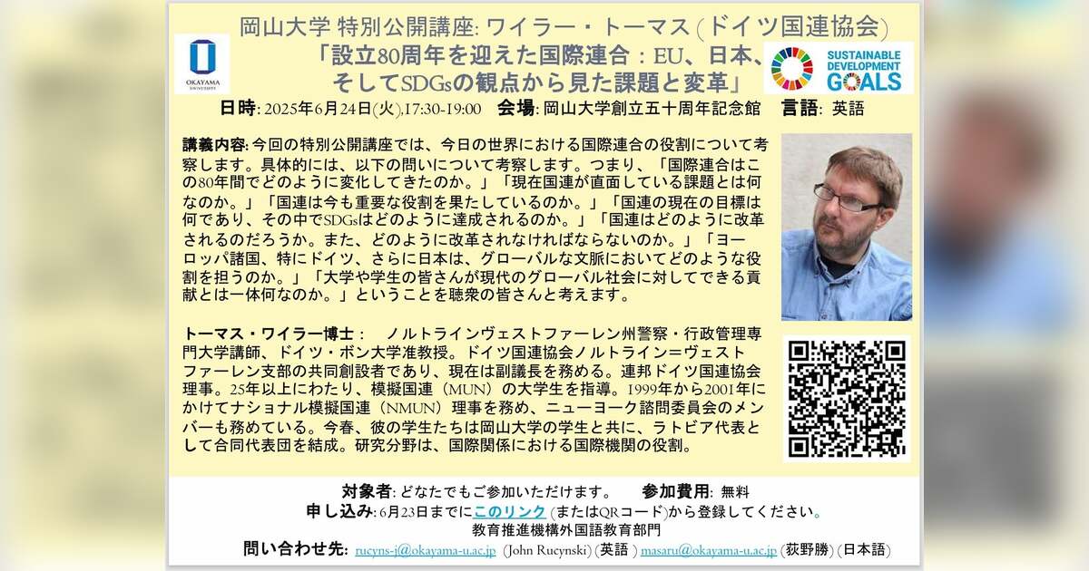 国立大学法人岡山大学(本部:岡山市北区、学長:那須保友)は、2025年6月24日(火)17:30~19:00に特別公開講座 ワイラー・トーマス講演「設立80周年を迎えた国際連合:EU、日本、そしてSDGsの観点から見た課題と変革」を、本学津島キャンパスの岡山大学創立五十周年記念館で開催します。