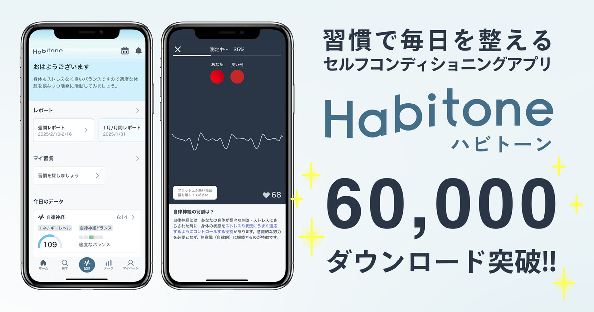 株式会社DUMSCO(所在地:東京都港区、代表取締役CEO 西池成資、以下 当社)は、“習慣で毎日を整える”セルフコンディショニングアプリ「Habitone」(ハビトーン)のダウンロード数が、6万件を突破したことを報告いたします。Habitone(ハビトーン)は、スマートフォンカメラによる自律神経の状態の測定や日々の体調を記録し、加えて習慣を整える提案をすることで「いい日」を増やすサポートを行います。多くの人が感じる「なんとなく不調」に寄り添い、日常のちょっとした変化による健康状態の向上を目指します。