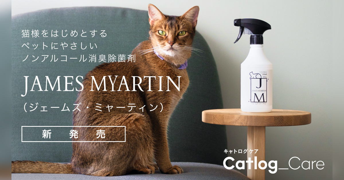 株式会社RABO(本社:東京都渋谷区、代表取締役社長:伊豫 愉芸子、以下「RABO」)は、提供する猫様向けサービス『Catlog』より、ペットにも人にも心地よい「家族との暮らし」を考えた新ケアブランド「Catlog ケア」を立ち上げたことをお知らせいたします。また、あわせて、「Catlog ケア」の第一弾ケアアイテムとして、猫様をはじめとするペットにやさしいノンアルコール消臭除菌剤「JAMES MYARTIN(ジェームズ・ミャーティン)」を発表、発売することをお知らせいたします。「ジェームズ・ミャーティン」は、株式会社ファーストコレクション(本社:東京都港区、代表取締役:竹内 伸介)が展開する除菌・消臭用アルコール製剤をはじめとしたライフスタイルブランド『JAMES MARTIN(ジェームズマーティン)』とCatlogのコラボレーションにより、ノンアルコールで高性能なペットにも人にもやさしい消臭除菌剤として誕生しました。