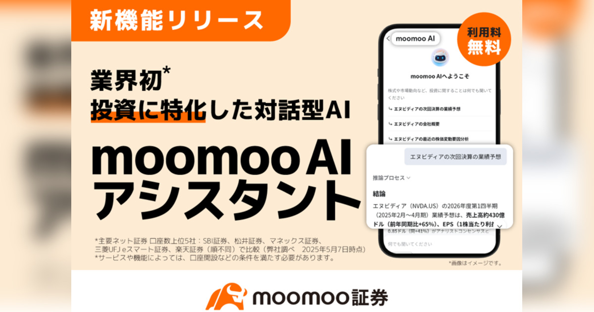 国内でアプリダウンロード数150万件(※2)を突破したネット証券のmoomoo証券株式会社(ムームー、本社:東京都渋谷区、代表取締役社長:伊澤フランシスコ、以下「moomoo証券」)は、ネット証券として業界初(※1)の投資に特化した対話型AI機能「moomoo AI」サービスを開始いたしました。投資概念の解説から、複雑な投資の意思決定を左右する上での重要な情報の分析まで対応し、一歩先を行く投資体験を無料(※3)で提供いたします。