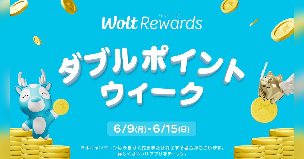 デリバリーサービス「Wolt(ウォルト)」を展開するWolt Japan株式会社(本社:東京都渋谷区、代表:ナタリア・ヒザニシヴィリ、以下 Wolt)は、2025年6月9日(月)から6月15日(日)までの期間、Woltへのご注文でポイントが通常の2倍獲得できる「Wolt Rewards(ウォルト リワーズ)ダブルポイントウィーク」を開催します。日本国内のすべてのエリア、すべてのお客様が対象で、期間中にWoltのデリバリーをご注文いただくだけで、2倍のポイントが貯まります。