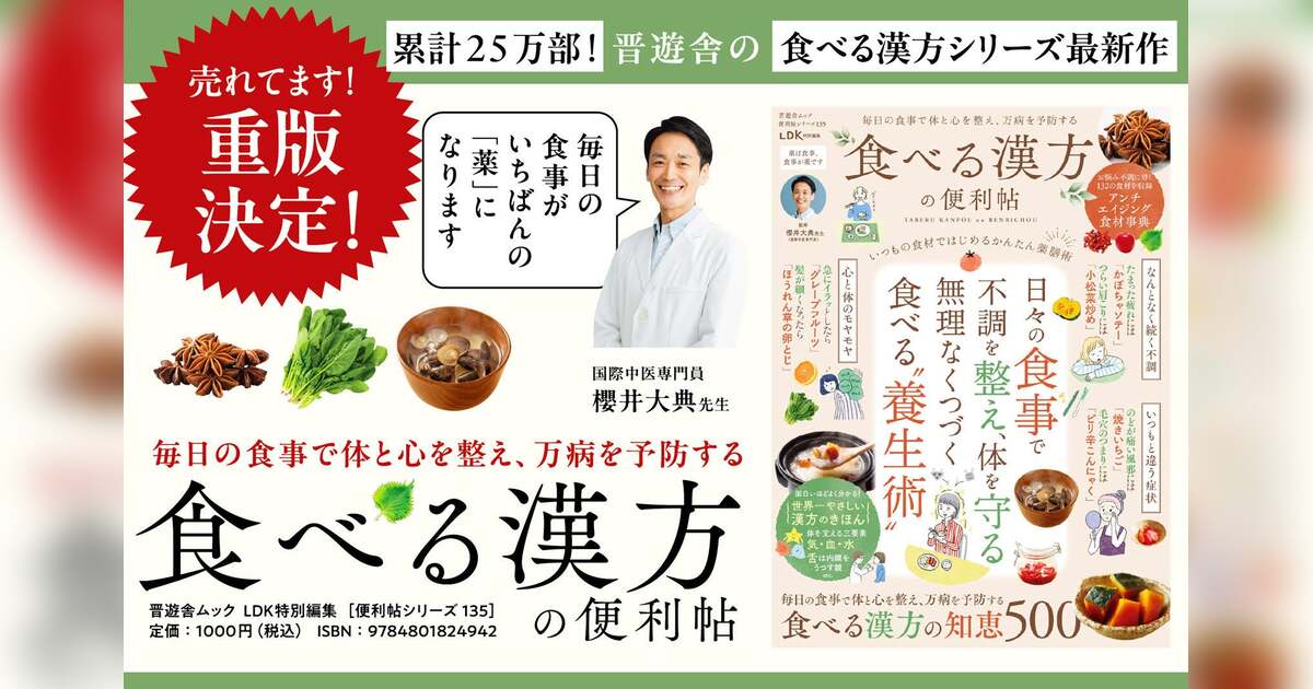本書は、Xフォロワー18万人を誇る漢方の専門家、櫻井大典先生が不調別に効能がある「食べる漢方」を紹介。また、中医学の観点からみた生活改善のコツや体質別のおススメ食材もお届けします。発売後すぐに重版した、現在注目の一冊です。