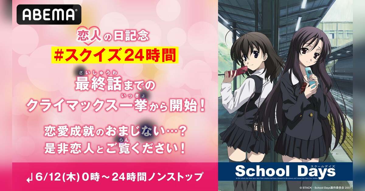 新しい未来のテレビ「ABEMA」は、6月12日の「恋人の日」に合わせ、当日の2025年6月12日(木)午前0時より、「#スクイズ24時間」と題し、恋愛アニメ『School Days』を24時間ノンストップ無料一挙放送いたします。