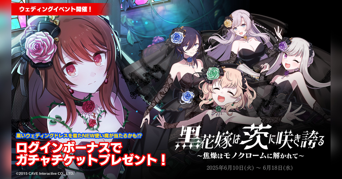 株式会社ケイブ(本社:東京都目黒区、代表取締役社長:秋田英好、証券コード:3760)が配信中のシューティングゲームアプリ『ゴシックは魔法乙女〜さっさと契約しなさい!~』(『ごまおつ』)におきまして、6月10日(火)よりウェディングイベント『黒花嫁は茨に咲き誇る〜焦燥はモノクロームに解かれて〜』を開始いたしました。