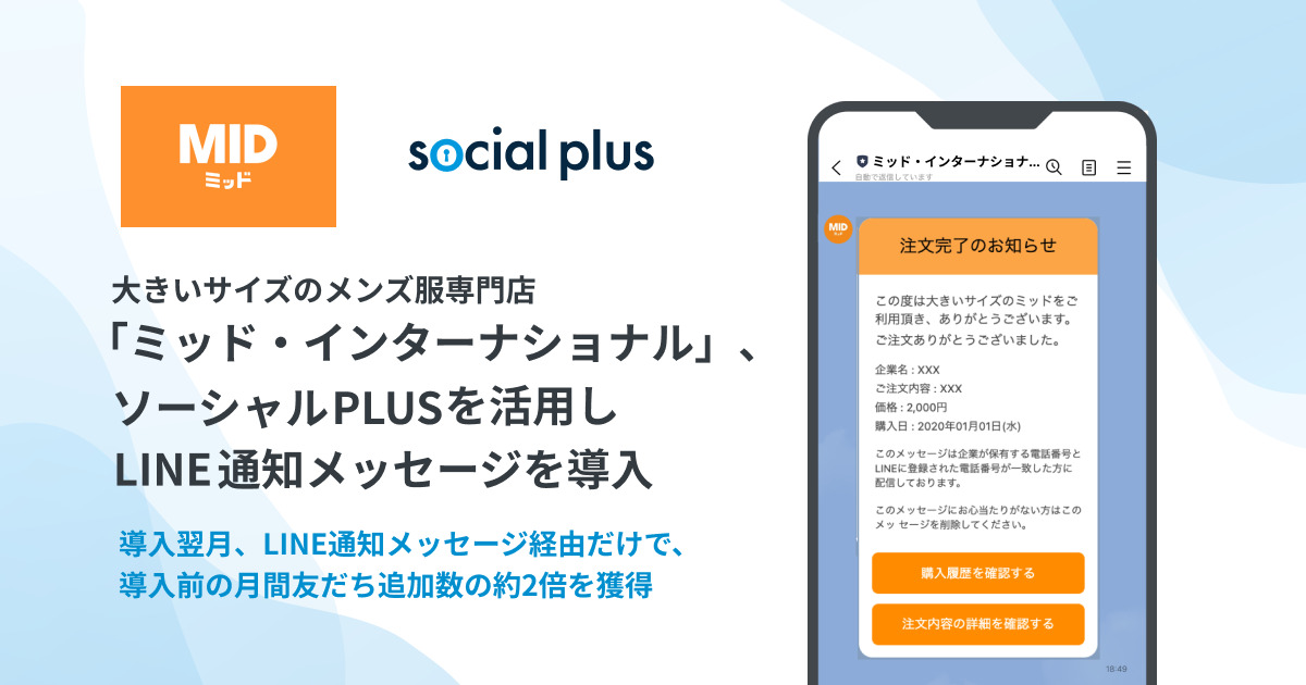 株式会社ソーシャルPLUS(所在地:東京都港区、代表取締役:佐藤 亮介)は、株式会社マンチェス(本社:岐阜県岐阜市、代表取締役:髙見澤 聡)が運営する大きいサイズのメンズ服専門店ミッド・インターナショナルにおけるLINE通知メッセージ導入において、LINE公式アカウントの拡張ツール「ソーシャルPLUS」が採用されたことをお知らせします。