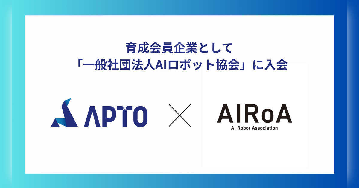 株式会社APTO(本社:東京都、代表取締役:高品良)は、一般社団法人AIロボット協会(英称:AI Robot Association、略称AIRoA)に育成会員企業として入会しましたので、お知らせします。