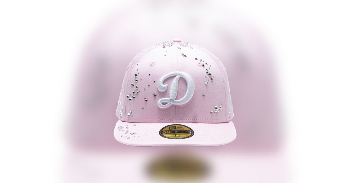 美術館のファンシージュエリーから着想を得たデザインで、パステルカラーのベースボールキャップをベースに全体に大粒のスワロフスキークリスタルを装飾した「Jewel Cap」。
