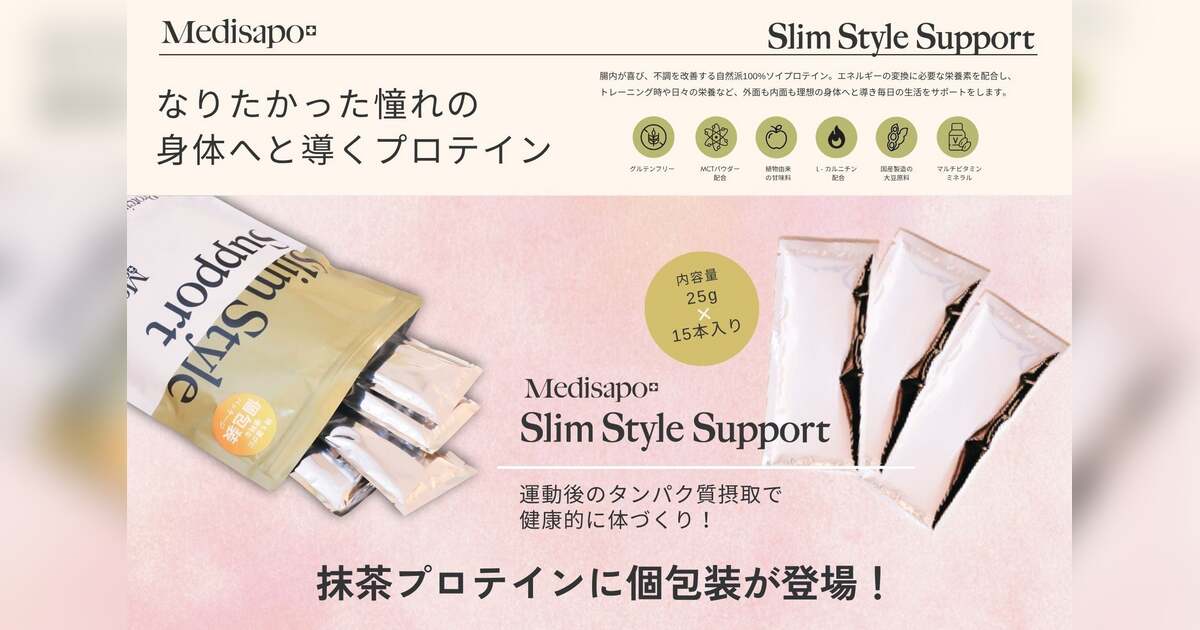 今回個包装版として新登場するのは、「Medisapo(メディサポ)」シリーズの中でも圧倒的な支持を集める「Slim Style Support(抹茶味)」(※以下SSS)。三大栄養素である タンパク質・糖質・脂質を効率的にエネルギーに変換するために必要な栄養素を配合し、代謝改善やダイエットサポートを求める多くのユーザーに愛用されている注目商品です。